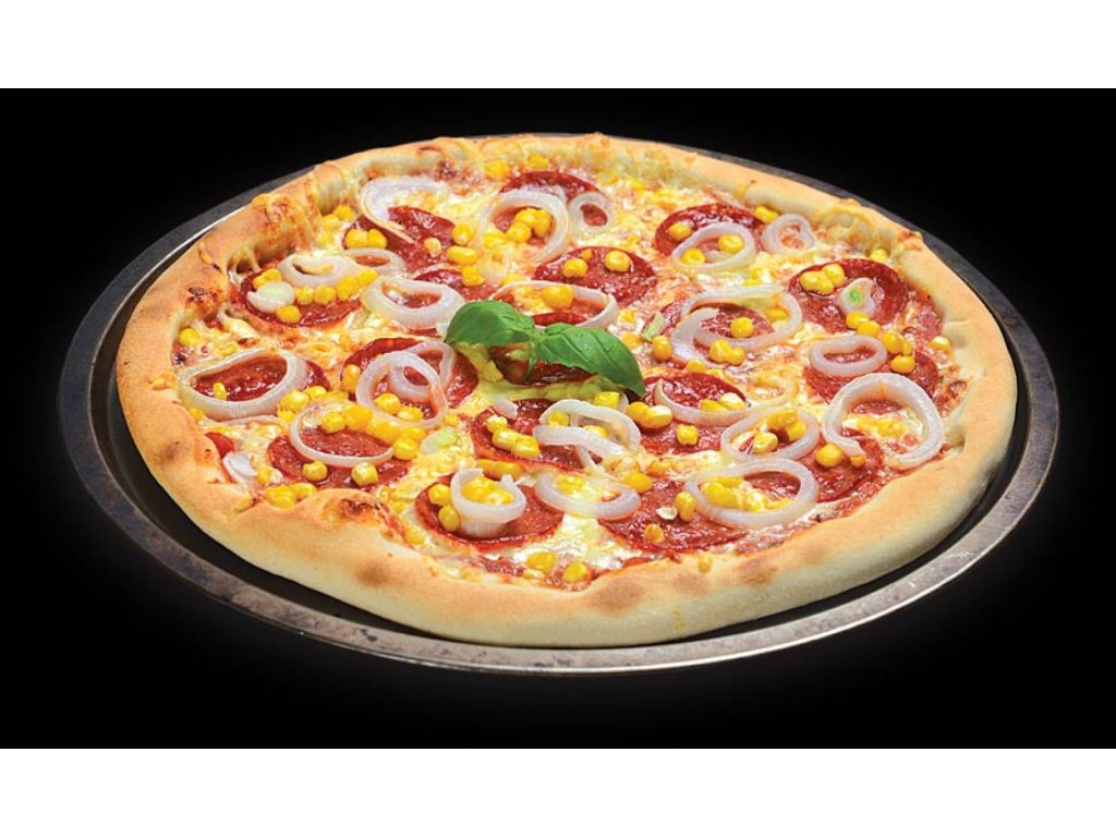 - pšeničná mouka, voda, rajčatový základ s kořením a bylinkami, česnek, sýr Eidam, sýr Mozzarella, paprikový salám (min. 8%), kukuřice sladká - zrno, cibule, extra panenský olivový olej, sůl, cukr, pekařské droždí, oregan